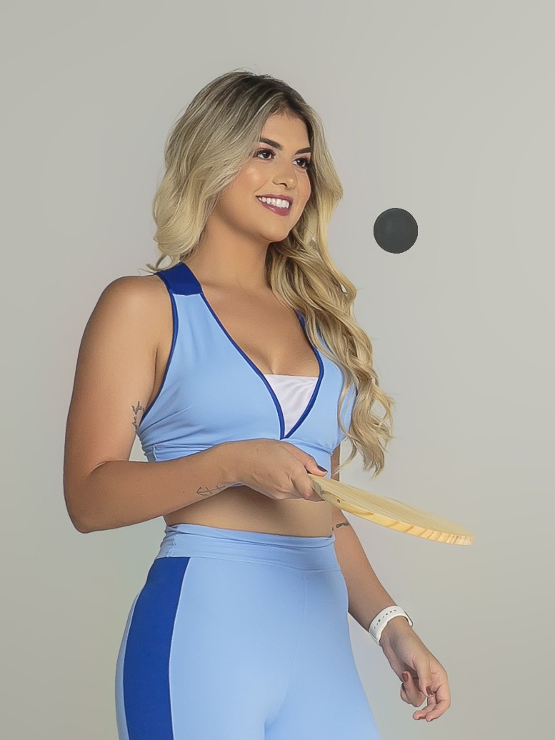 TOP CARINHO | Top com bojo removível e alças transpassadas nas costas. Cor Azul celeste com detalhes em branco e azul royal.